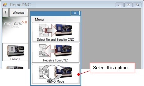 To start Remo click the relevant CNC icon and select 'Remo Mode' from the menu. (If you don't see this option then you didn't enable it in Setup)